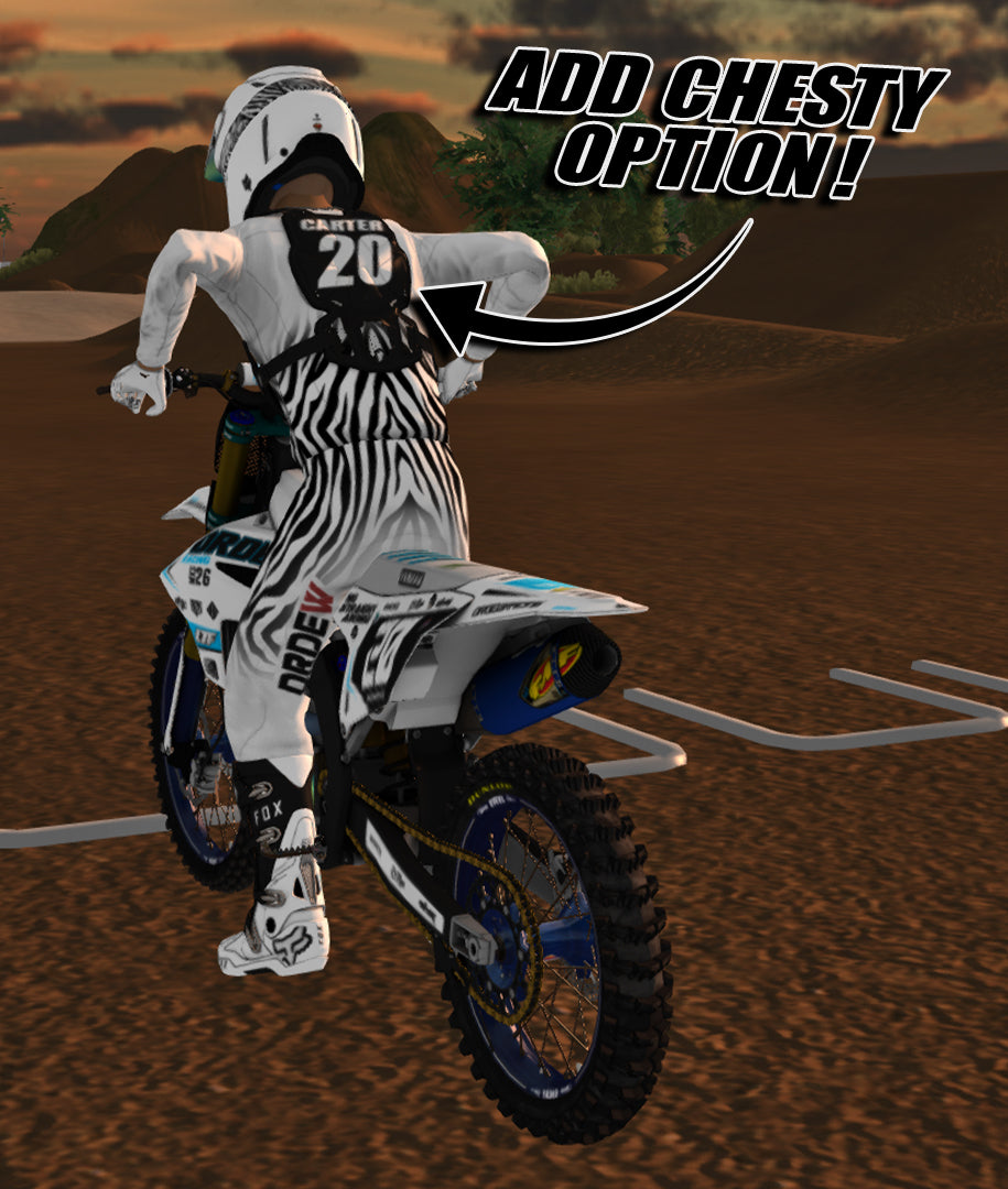 This will include the A1 Zebra Print gear set as well as the Anaheim 1 White Yamaha Mx Simulator bike on both the 250 and 450 with your name and number on it for Mx Simulator.